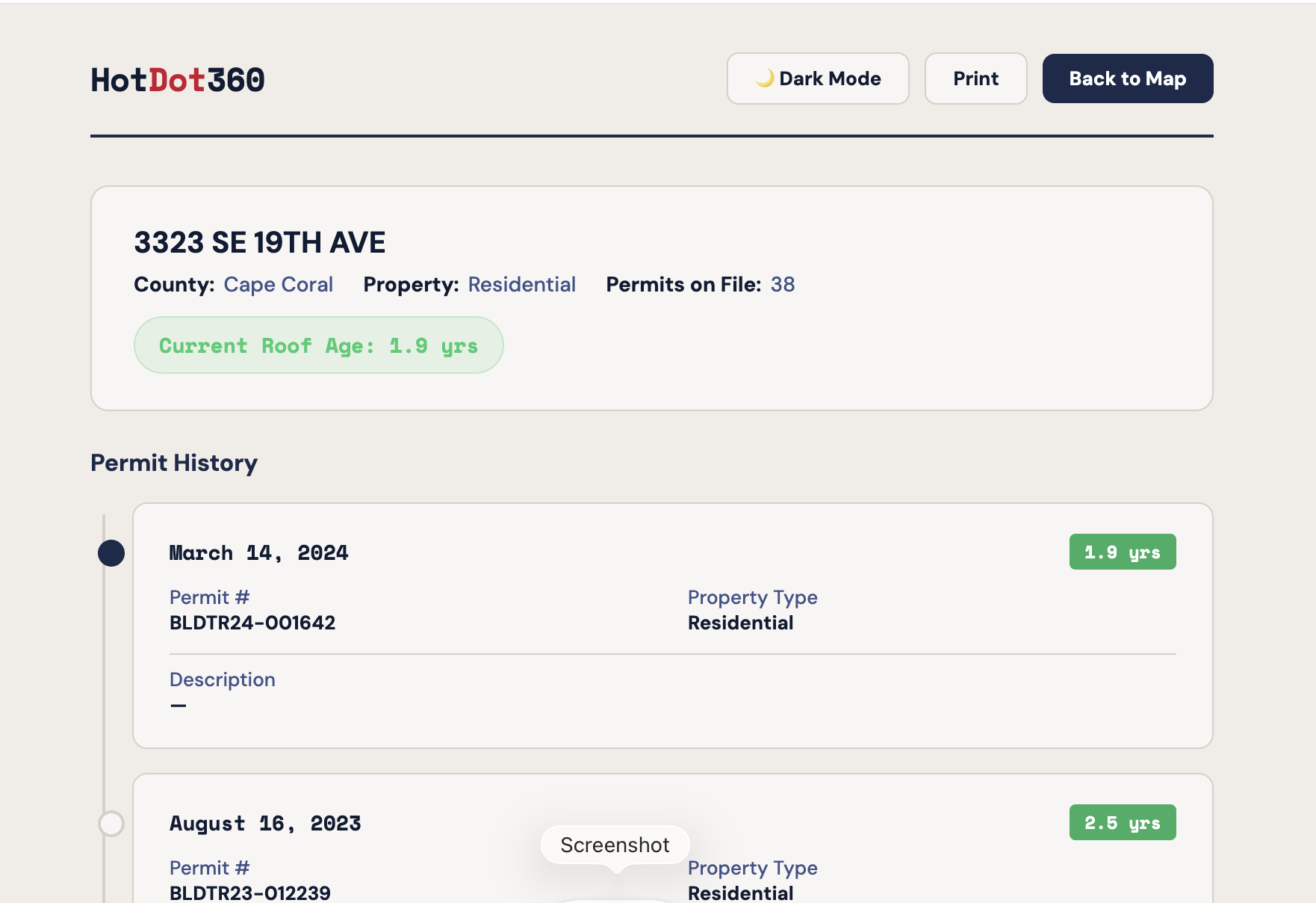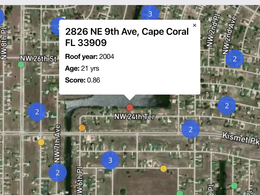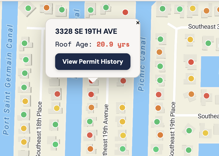 Click any dot to reveal the verified history behind the roof. See the exact age, the permit year, and our proprietary score. Decide for yourself if this level of data gives your sales team the “unfair advantage” they’ve been missing.