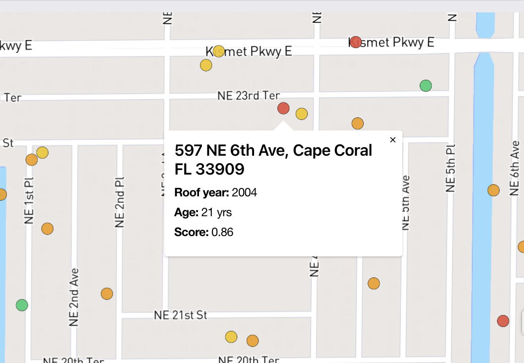 See the opportunities – Instantly view roof ages by color-coded dots.